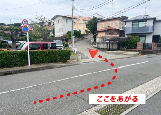 2.速度制限と駐車禁止マークを通り過ぎて、◯リング模様の坂道を上がる