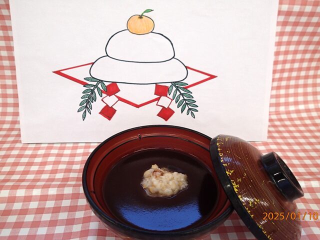 松の内も終わって明日は鏡開きです。お供えの鏡餅は美味しくいただきます。患者さまには、お餅に見立てた白玉麩を温かいおしるこに添えて。