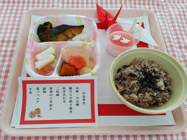 2023年9月15日(金)の「敬老弁当」です。もち米を使用しない“軟らかお赤飯”ですが、皆さん喜んで召し上がって下さいました。